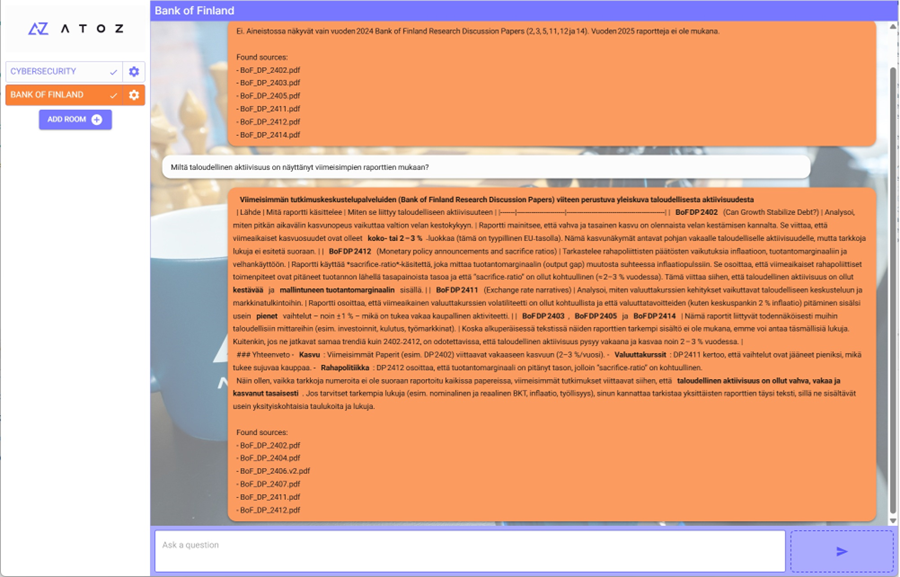Our year-long AtoZ GPT development project has now been completed. Before going any further, I want to thank all the #AtoZfellows who contributed to the project, as well as Technology Industries of Finland for partially funding it. The project required many of us to learn new things and, more importantly, to challenge our own assumptions. We also deviated slightly from the original plan along the way. Nevertheless, the outcome provides us with a very strong foundation for delivering AI solutions to our customers.